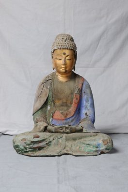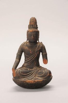 この仏像は、両手の先がなくなっていますが、身につけている飾りや衣で、菩薩をあらわしていることは分かります。長い髪は頭上に高く結い上げて、毛先をすこし肩に垂らしています。冠のような飾りやネックレスも細かくてすてきです。すわっているのはハスの花。横からみると、背中が垂直にカットされているので、壁状のところに付けられていた仏像であったと考えられます。
