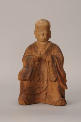 坊主頭の僧侶のすがたであらわされた神さまの像です。袈裟という、お坊さんの衣をまとっています。日本に仏教が伝来したのち、日本古来の神と仏はまざりあって信仰されるようになりました。この像の底には「勢至菩薩」という仏の名前が書かれています。僧のすがたで現れた神、その本当のなまえは「勢至菩薩」だ、と考えているようです。