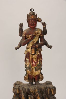 かぶとをかぶり、よろいをまとって、左に向かって威嚇しています。ポーズは、左手に弓をもち、右手でその弦を引いている姿です。このようなたたかう像も仏像です。