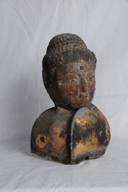 この仏像は、頭上に肉髻をあらわした如来の頭だけが、蓮の花びらを組み合わせて作った台の上に乗っているものです。首の部分には焦げた痕跡があり、火災に遭って体部を失い、頭部だけが残されたものと考えられます。そんな状態になっても、大切に守り伝えられてきたのです。