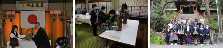 このたび、博物館でお預かりしている有田川町・田殿丹生神社の丹生明神・高野明神坐像のお身代わり神像が完成し、田殿丹生神社ご関係のもとへ伺って複製を奉納いたしました。製作に携わった県立和歌山工業高等学校の生徒および和歌山大学教育学部ミュージアムボランティアの学生が訪れ、完成したお身代わり仏像を地域住民の代表者にお渡しし、交流を図りました。