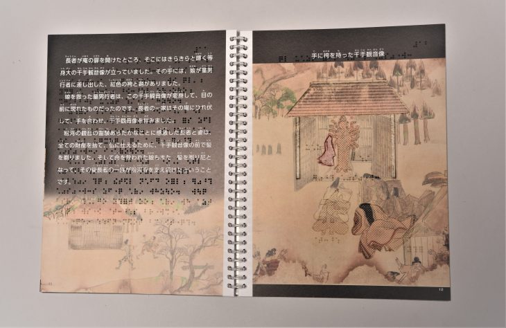 3、視覚障害者が地域の歴史や文化に関する情報に接するための「さわれるレプリカ」については、2と同様に着色作業が完了しなかったため、無着色の資料として完成させた。「さわって読む図録」については県立和歌山盲学校と連携して『粉河寺縁起-手で読む神秘の物語-』を作製した。施設のユニバーサルデザイン化の取り組みとともに、全国主要点字図書館ほかに寄贈し、事業の普及に努めた。