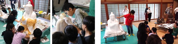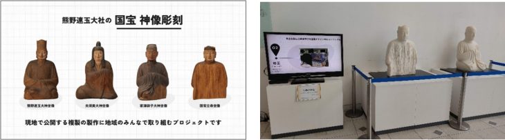 【実施後の成果】本事業では、熊野速玉大社国宝神像4軀の実物大複製4体および彩色テスト用の2分の1サイズの複製4体の造形が完了した。このうち実物大1体とテスト用2体が完成に至っており、その他の複製は所蔵者との協働で引き続き製作を続けている。地域との連携では、特にワークショップの開催に当たり新宮市教育委員会の協力を得て、校長会での説明や小中学校教諭への営業を行い、当該地域の子どもたちの博物館利用実態を把握できた。ワークショップでは文化財修理等にも目を向け、地域住民自身が地域の文化財を誇り、協力して継承するものであることを伝えられたと感じる。